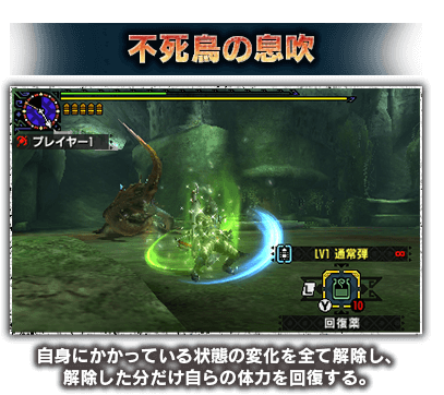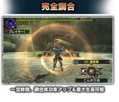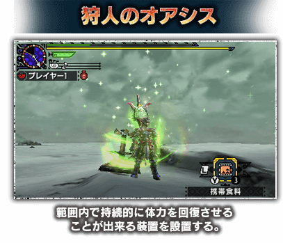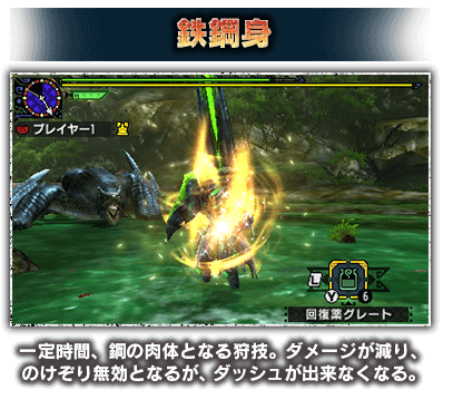 ・狩技は3DSの下画面に表示される ・下画面の「狩技パネル」タッチで発動 ・モンスターを攻撃する等の行動でゲージが溜まる ・初期ゲージは「黄色」 ・ゲージが「赤色」になると発動可能
